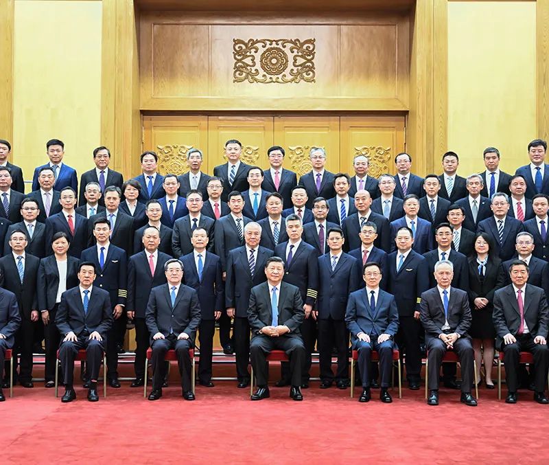 9月30日,黨和國家領導人習近平、韓正等在北京人民大會堂會見C919大型客機項目團隊代表并參觀項目成果展覽。這是習近平等會見C919大型客機項目團隊代表。新華社記者 丁林 攝