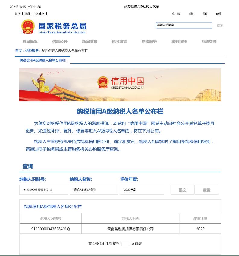 云南省融資擔保有限責任公司獲評2020年納稅信用A級企業