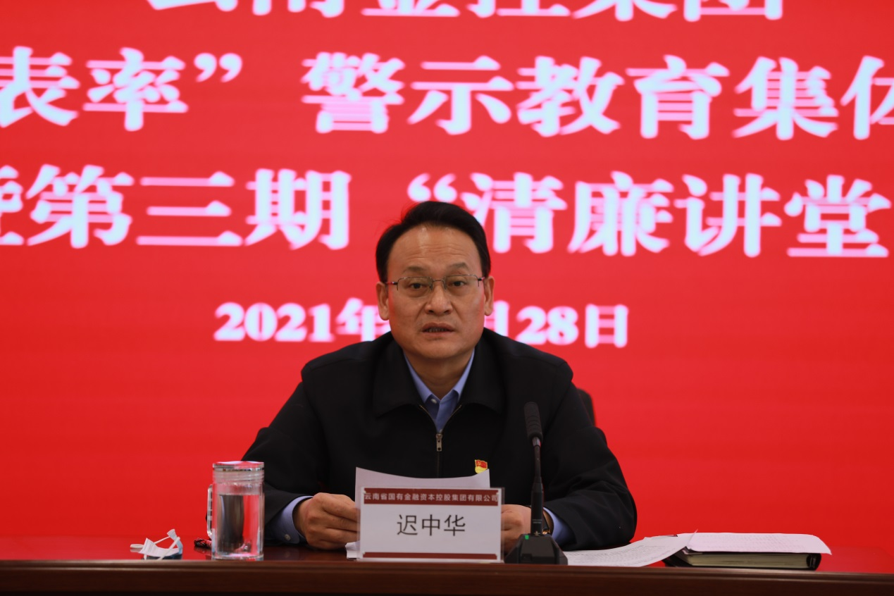 ? 云南金控集團黨委認真貫徹落實省委“五個作表率”專題學習教育工作要求,把開展以案促改警示教育和集體廉政談話作為落實“五個作表率”專題學習教育的具體行動和重要抓手,持續構建云南金控風清氣正的政治生態。2021年12月28日,集團黨委組織集團領導班子成員、集團中層管理人員開展“五個作表率”警示教育集體廉政談話暨第三期“清廉講堂”活動。