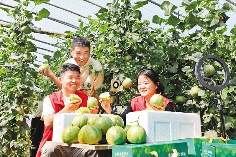 各地黨員、干部大力發揚密切聯系群眾的作風,立足崗位擔當作為、服務群眾。圖為2025年5月11日,河南省新鄉市延津縣南秦莊村甜瓜種植大棚內,黨員志愿者通過現場直播,幫助農戶推銷甜瓜。 人民圖片 張燕/攝