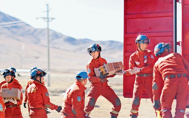 新時代以來,廣大青年在搶險救災前線沖鋒陷陣,在黨和人民最需要的時刻沖得出來、頂得上去,展現出自信自強、剛健有為的精神風貌。2025年1月7日,西藏自治區日喀則市定日縣發生6.8級地震。圖為1月9日西藏自治區森林消防總隊派出的救援人員在地震重災區日喀則市拉孜縣拉孜鎮措布村卸載救災物資。新華社記者 姜帆/攝